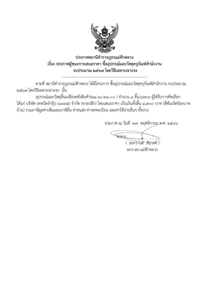 ประกาศผู้ชนะการเสนอราคา ซื้ออุปกรณ์และวัสดุครุภัณฑ์สำนักงาน งบประมาณ ๒๕๖๗ 27 พฤศจิกายน 2566 โดย admin / ข่าวจัดซื้อจัดจ้าง ประกาศสถานีตำรวจภูธรแม่ฟ้าหลวงเรื่อง ประกาศผู้ชนะการเสนอราคา ซื้ออุปกรณ์และวัสดุครุภัณฑ์สำนักงาน งบประมาณ ๒๕๖๗ โดยวิธีเฉพาะเจาะจง