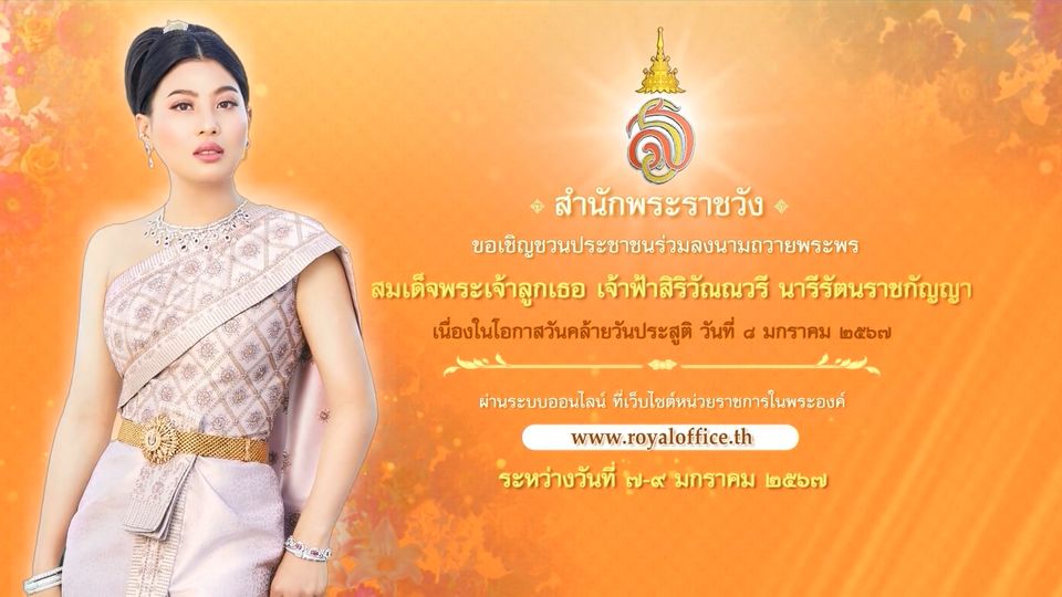 สำนักพระราชวัง ขอเชิญชวนประชาชนร่วมลงนามถวายพระพร สมเด็จพระเจ้าลูกเธอ เจ้าฟ้าสิริวัณณวรี นารีรัตนราชกัญญา เนื่องในโอกาสวันคล้ายวันประสูติ วันที่ ๘ มกราคม ๒๕๖๗ ผ่านระบบออนไลน์ ที่เว็บไซต์หน่วยราชการในพระองค์ www.royaloffice.th ระหว่างวันที่ ๗ – ๙ มกราคม ๒๕๖๗