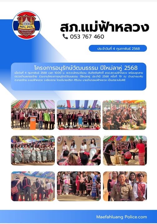 พ.ต.ต อัฑฒวโรดม ตันติตติยศักดิ์ สวป. สภ.แม่ฟ้าหลวง และสายตรวจตำบลเทอดไทยร่วมเปิดงาน โครงการอนุรักษ์วัฒนธรรมปีใหม่ลาหู่ ประจำปี 2568 ครั้งที่ 19 ณ บ้านปางมะหัน ม.8