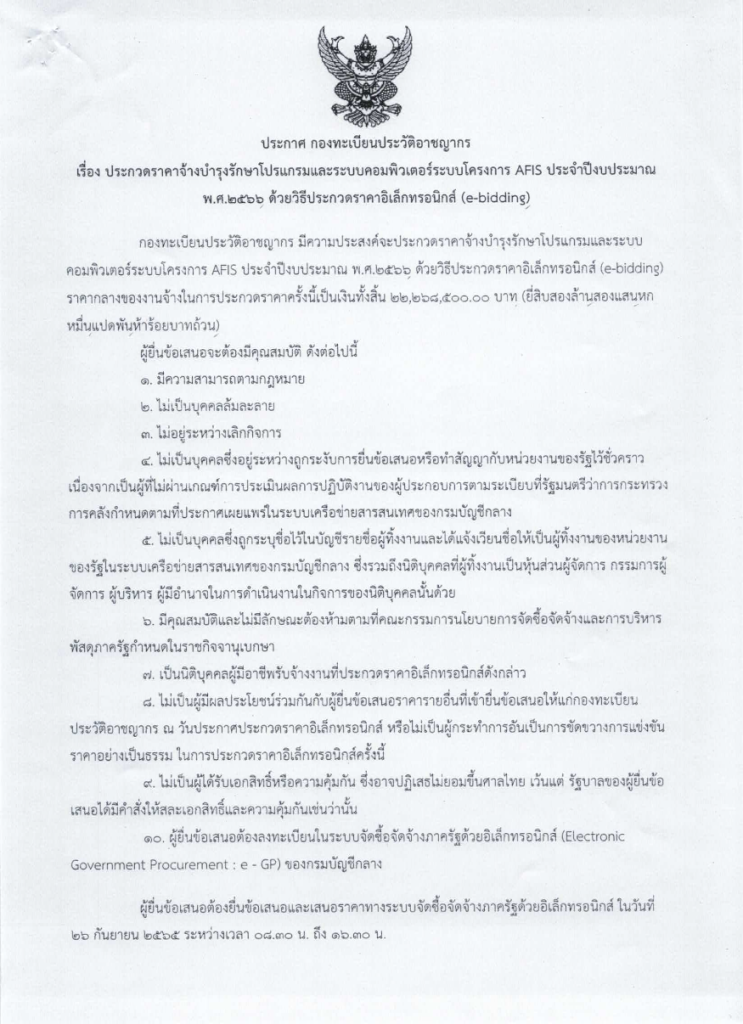 ประกาศกองทะเบียนประวัติอาชญากร 6 มกราคม 2566 โดย admin / ข่าวจัดซื้อจัดจ้าง ประกาศกองทะเบียนประวัติอาชญากร