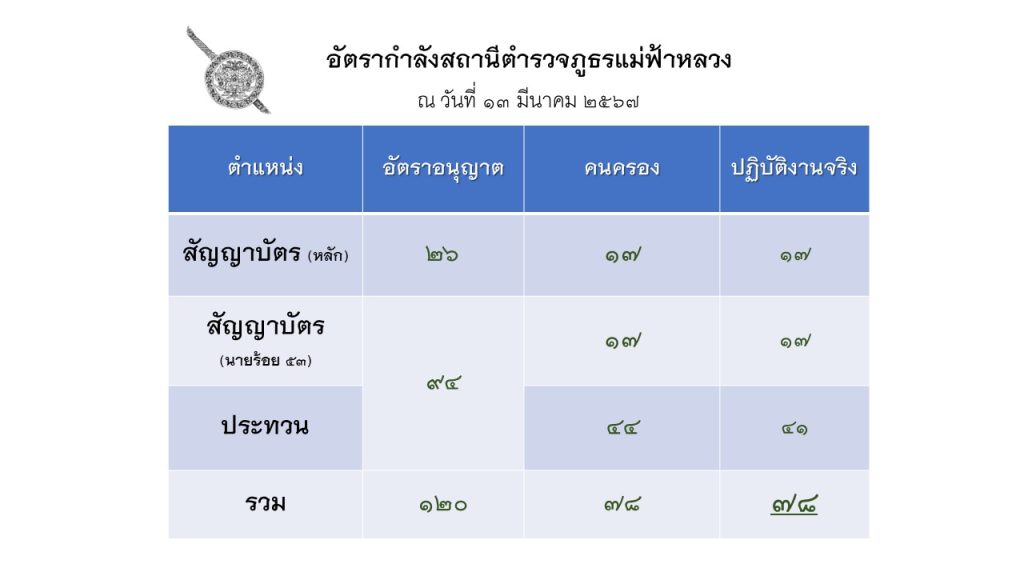 อัตรำกำลัง สภ.แม่ฟ้าหลวง ณ วันที่ 13 มีนาคม 2567